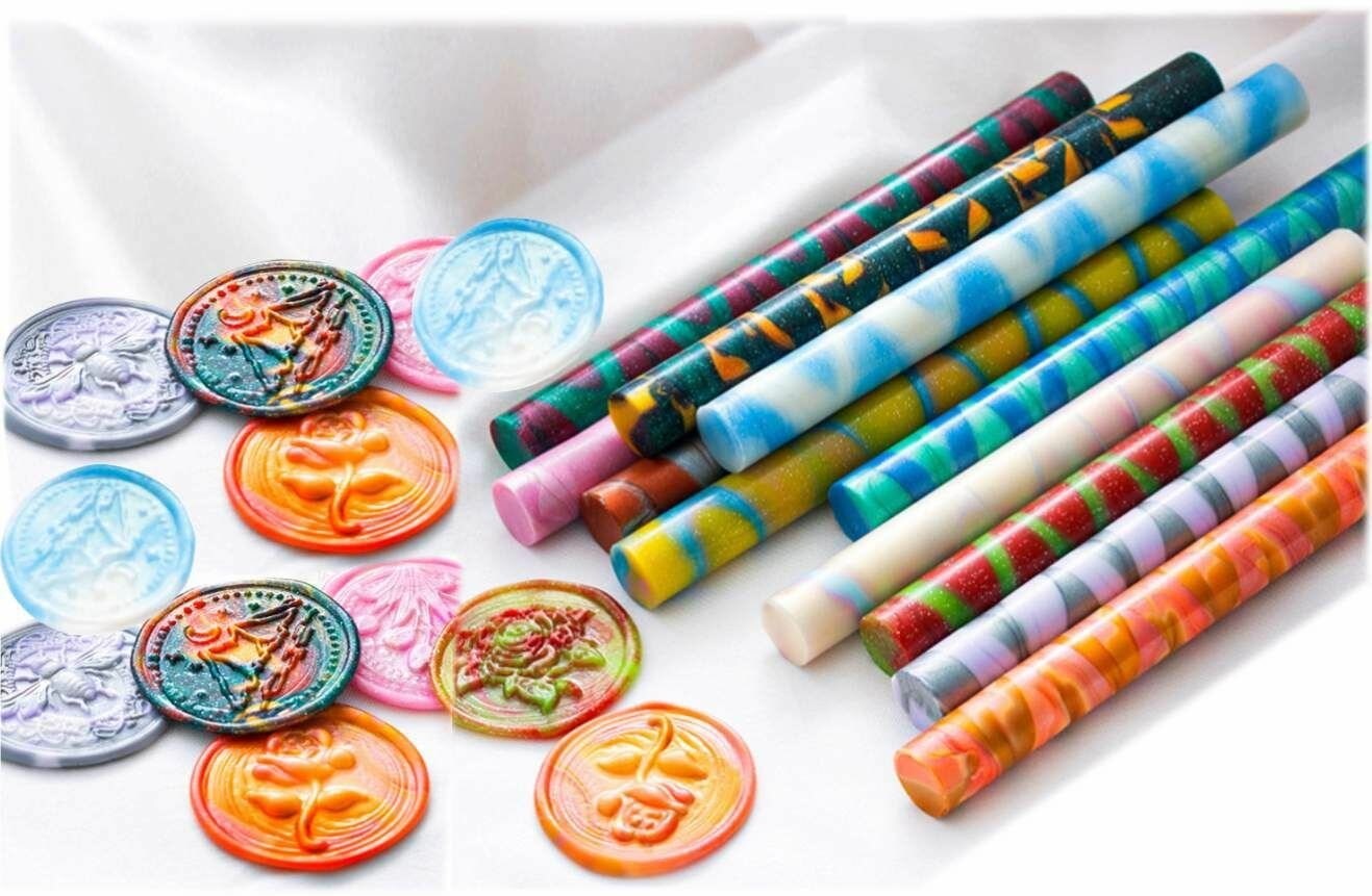 Набор: сургучных стержней (10штук палочек) цвета "Лунный микс" и пистолет для плавки сургуча