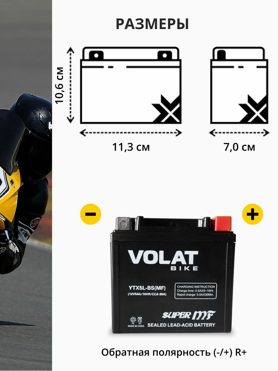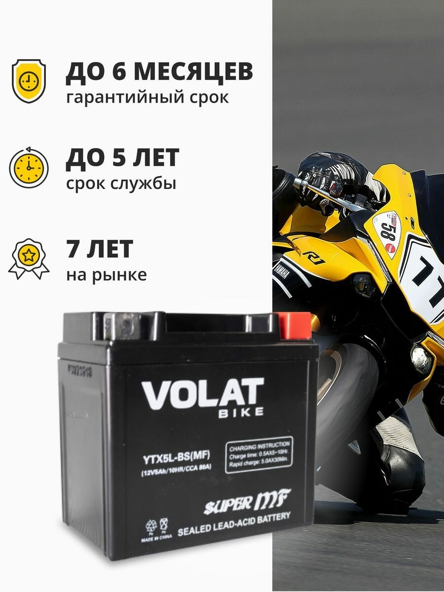 Аккумулятор для мотоцикла 12v Volat YTX5L-BS(MF) обратная полярность 5 Ah 80 A AGM, акб на скутер, мопед, квадроцикл 113x70x106 мм интересное: