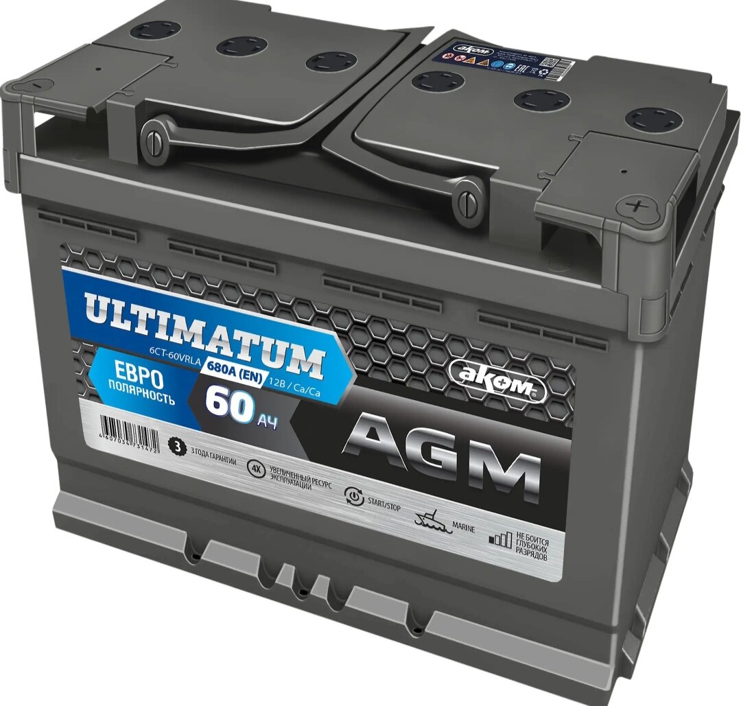 Купить AKOM 4607034731465 Аккумуятор 6СТ- 60 Уьтиматум AGM о.п. (пусковой ток 680А) L2 (AKOM)