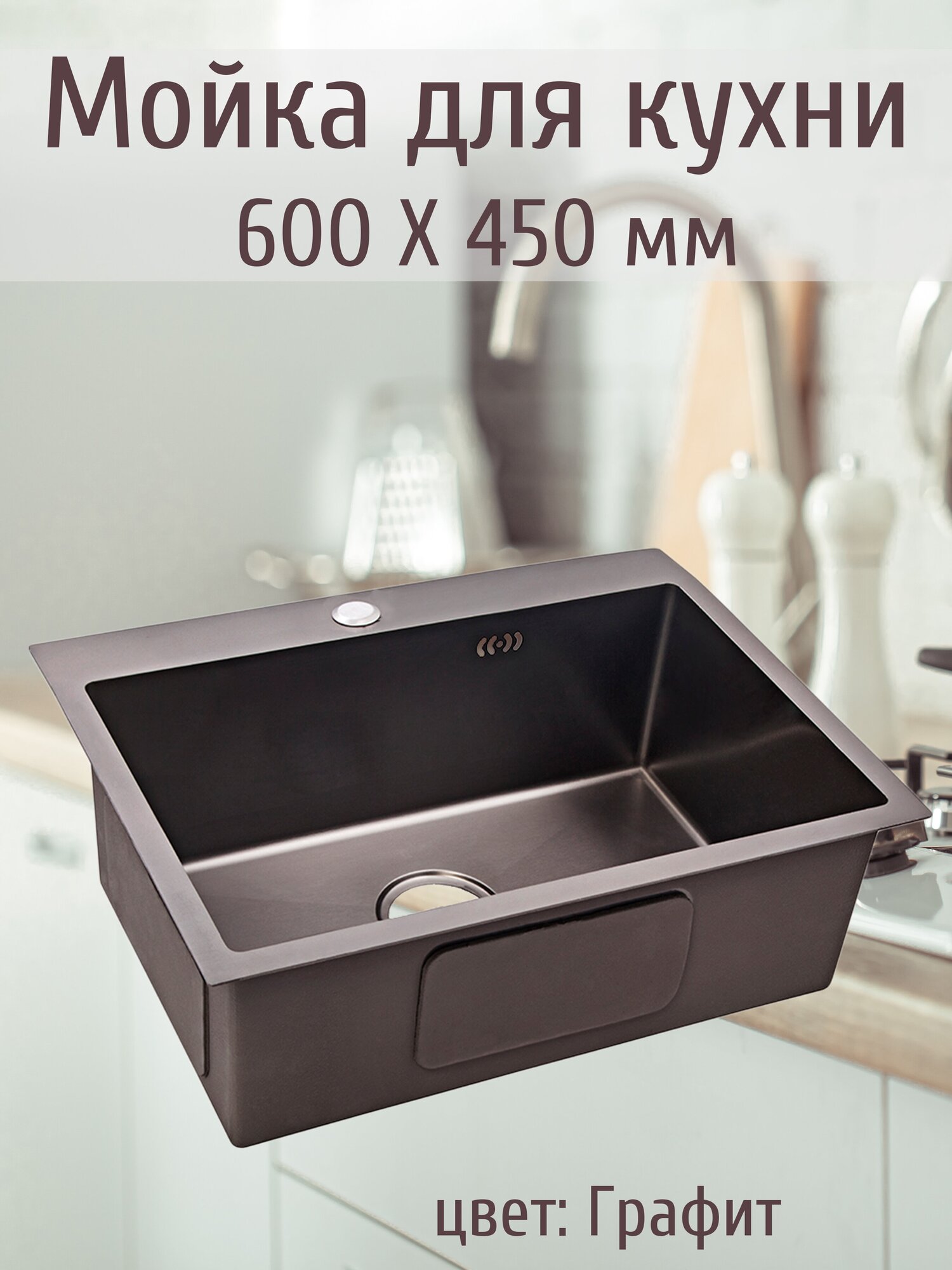 Мойка кухонная врезная Premial 600 х 450 мм со сливной арматурой, брашированная нержавеющая сталь, цвет графит