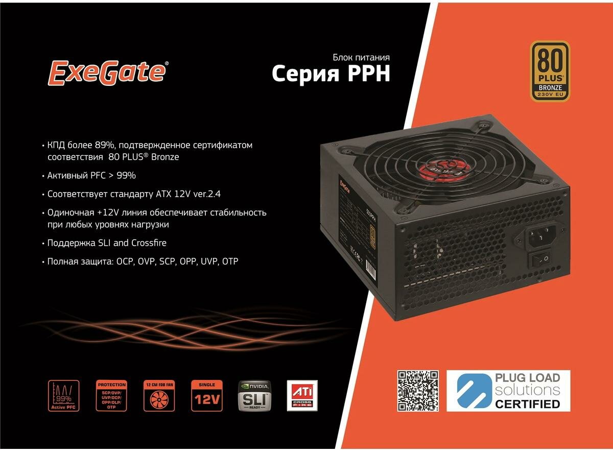 Блок питания 800W ExeGate 80 PLUS® Bronze 800PPH (ATX, APFC, SC, КПД 89% (80 PLUS Bronze), 12cm fan, 24pin, 2x(4+4)pin, 4xPCI-E, 8xSATA, 4xIDE, black, кабель 220V с защитой от выдергивания, Color box)