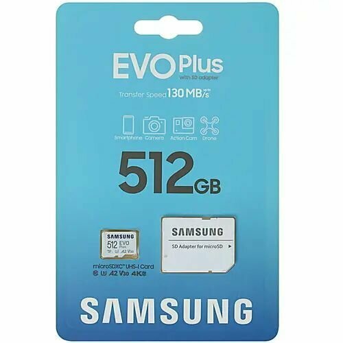 Карта памяти Samsung EVO Plus 512Гб microSDXC, C10/UHS-I U3, с адаптером SD (MB-MC512KA/EU)