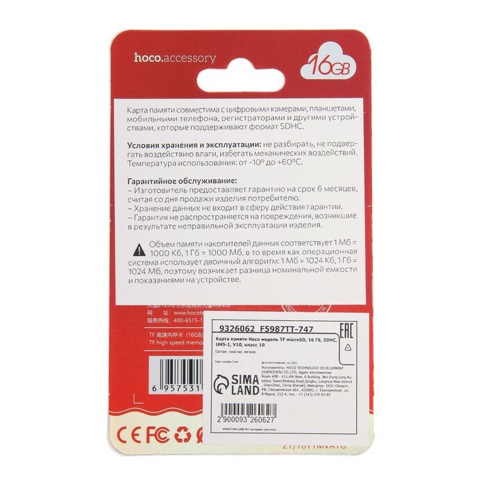 Hoco Карта памяти Hoco microSD, 16 Гб, SDHC, UHS-1, V10, класс 10 интересное: