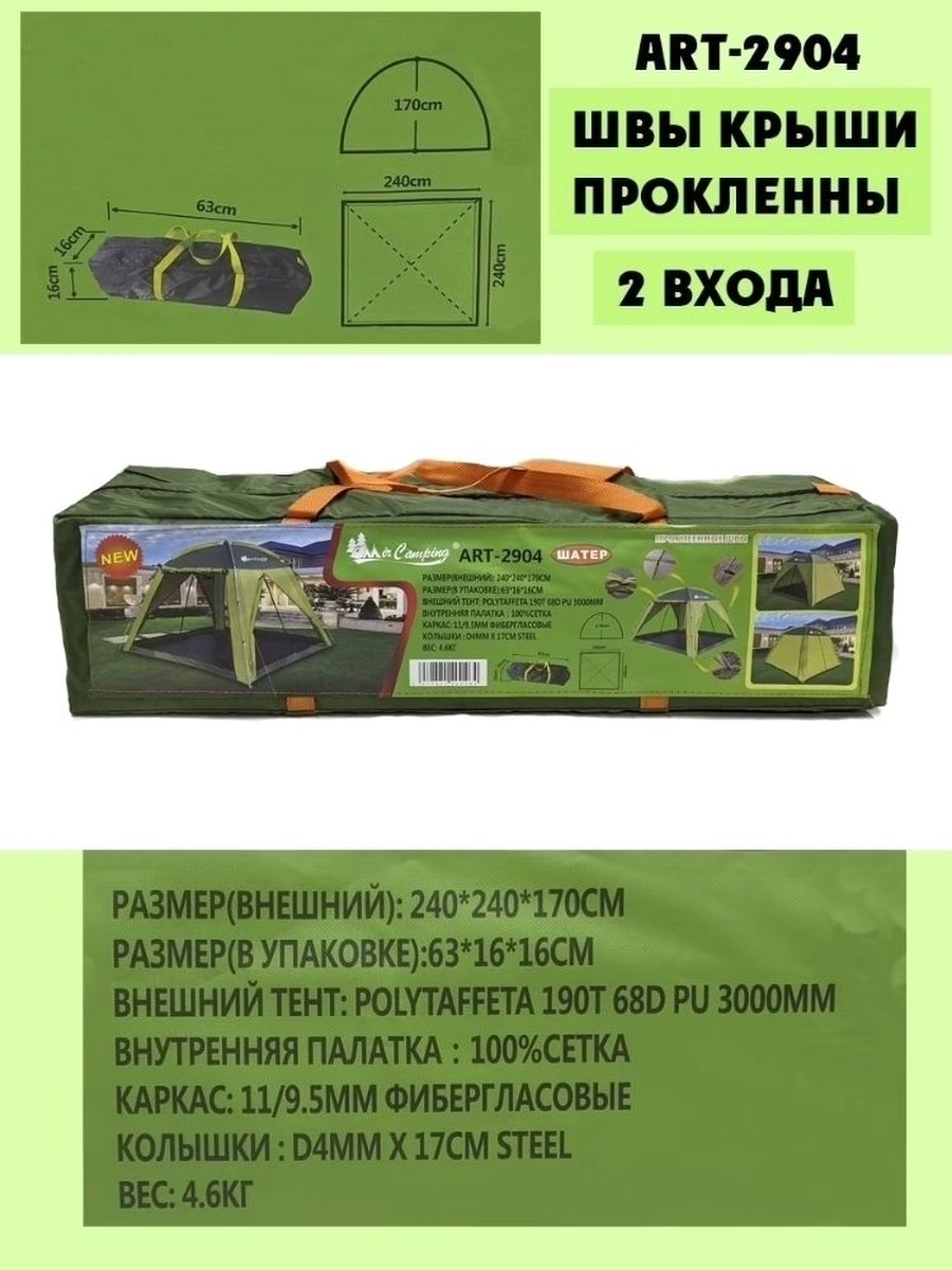 Шатер туристический 4 местная 2904 с полом из стального каркаса палатка