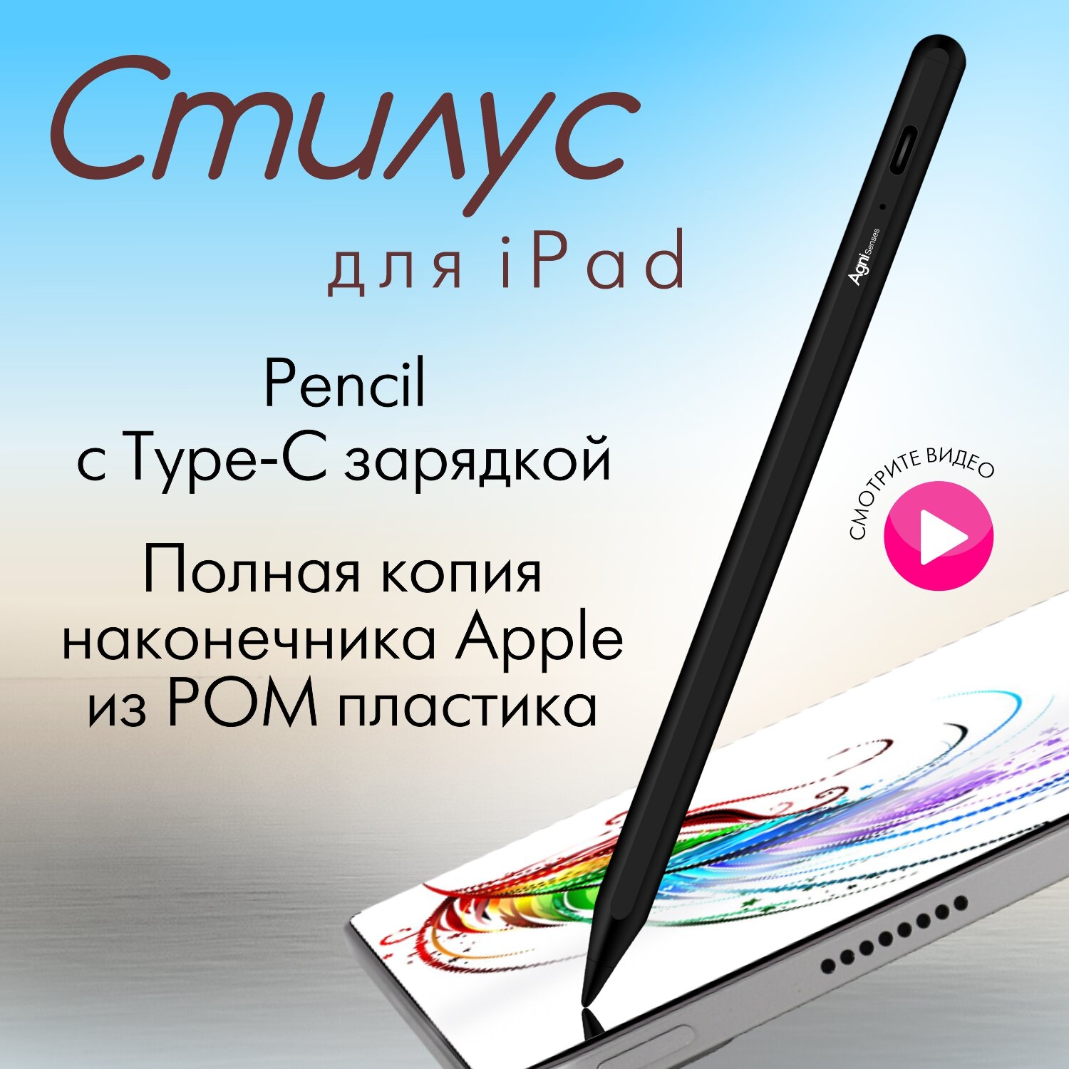 Купить Стилус для iPad, AGNI Senses. Черный Apple pencil с USB-C для планшета, с магнитным креплением