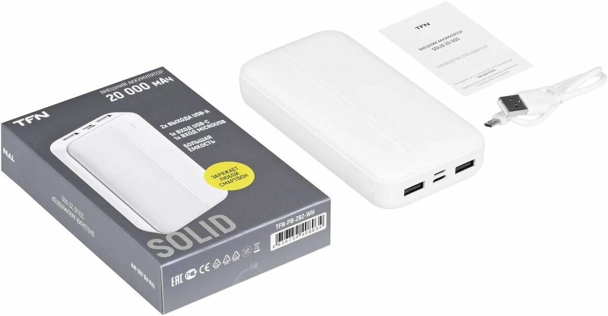 Мобильный аккумулятор TFN Solid PB-282 20000mAh 2.1A белый (TFN-PB-282-WH)