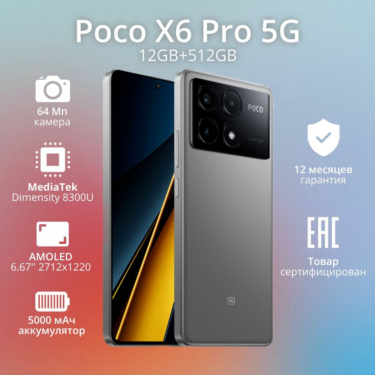 Смартфон Xiaomi POCO X6 Pro 12/512 ГБ RU, Dual nano SIM, серый