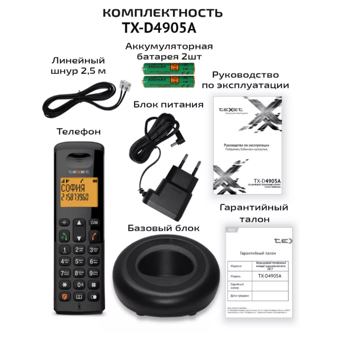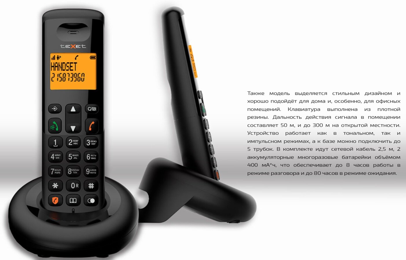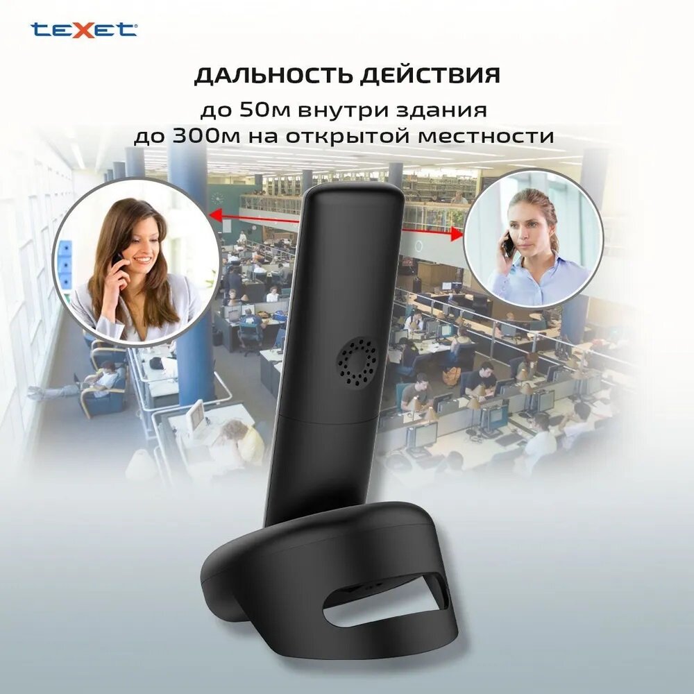 Радиотелефон TEXET TX-D4905A черный (127219) Радиотелефон DECT – teXet TX-D4905A имеет все основные функции беспроводного телефона – поддержка функций Caller-ID и АОН, память на входящие, исходящие номера, настройка даты и времени и будильник. Основной ос