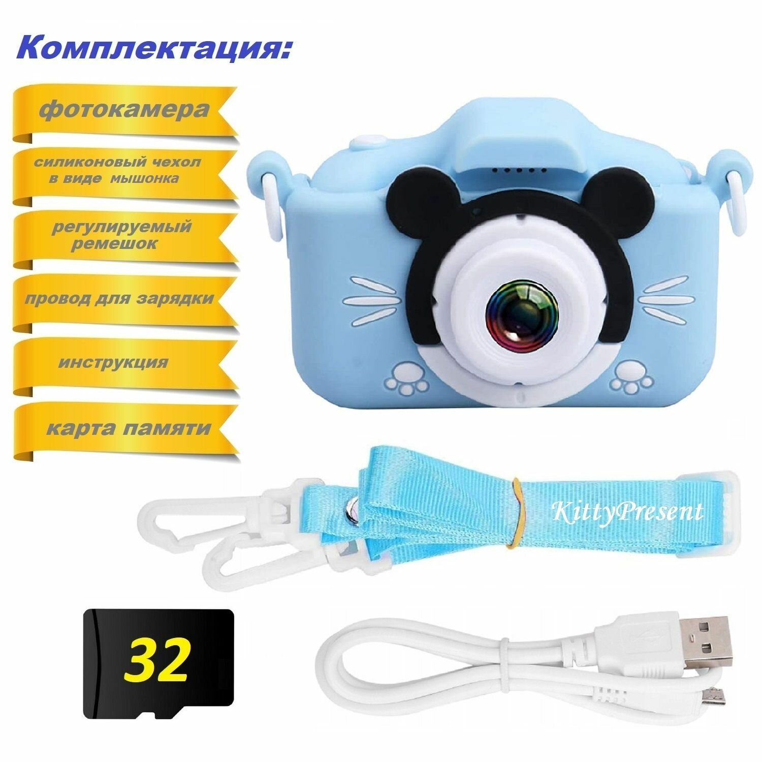 Купить Фотоаппарат детский Мышонок/Мышка (голубой) с селфи-камерой и играми + карта памяти 32 ГБ
