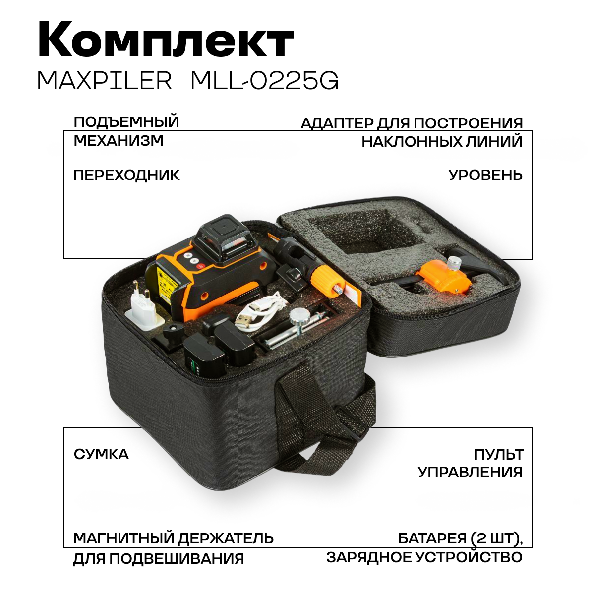 Лазерный уровень/нивелир MaxPiler MLL-0225G в сумке, 25м, зеленый, 360 градусов, 16 лучей, 2 АКБ