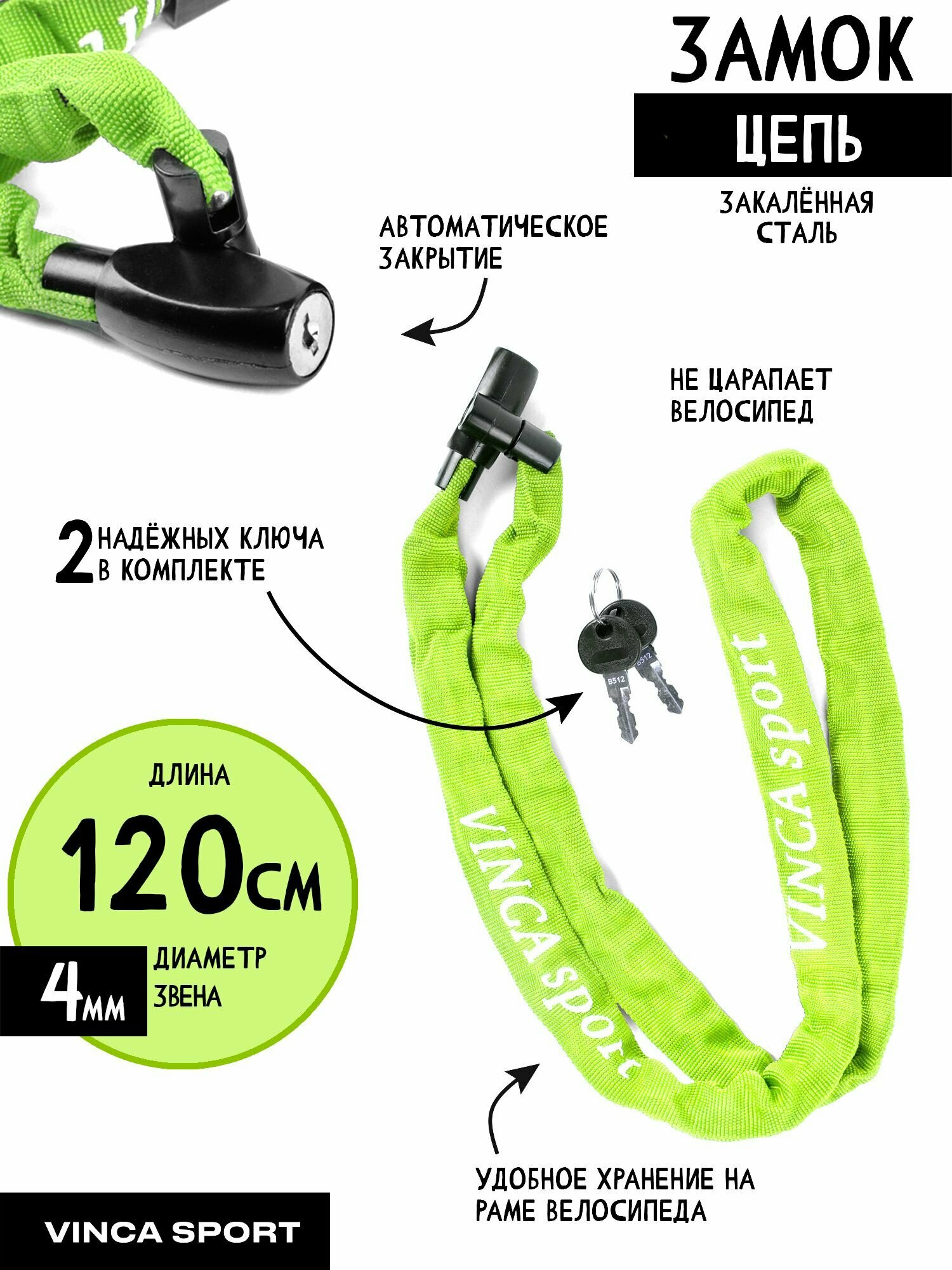 Купить VS 747 green. Замок велосипедный - цепь 4*1200мм, черная оплетка. инд.уп. Vinca Sport