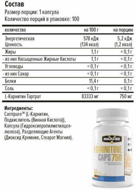 Maxler L-Carnitine 750, 100 капс. интересное: