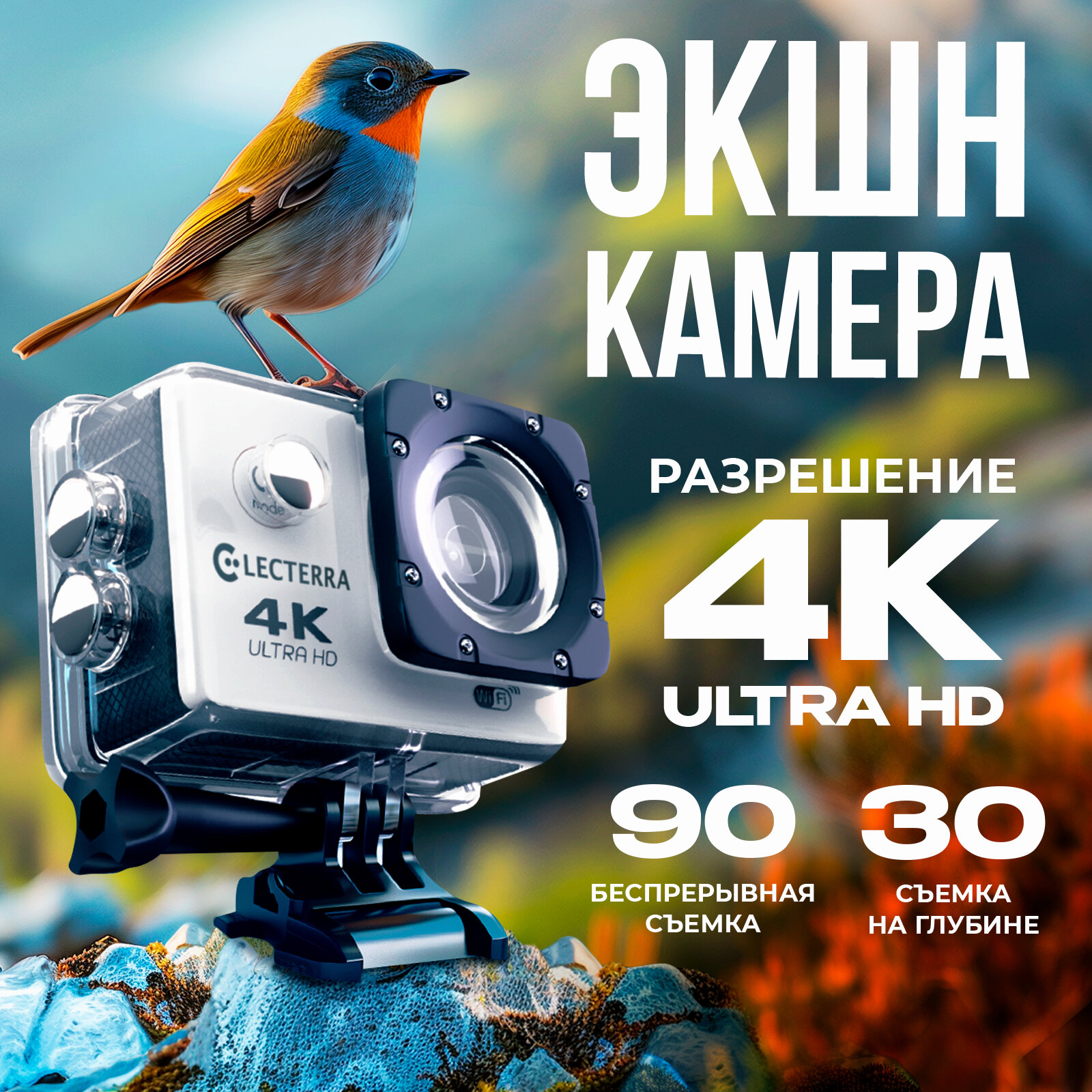 Electerra. Экшн камера 4К. Подводная съемка. Защитный бокс. Видеокамера для активного отдыха. Wi-Fi. Белая