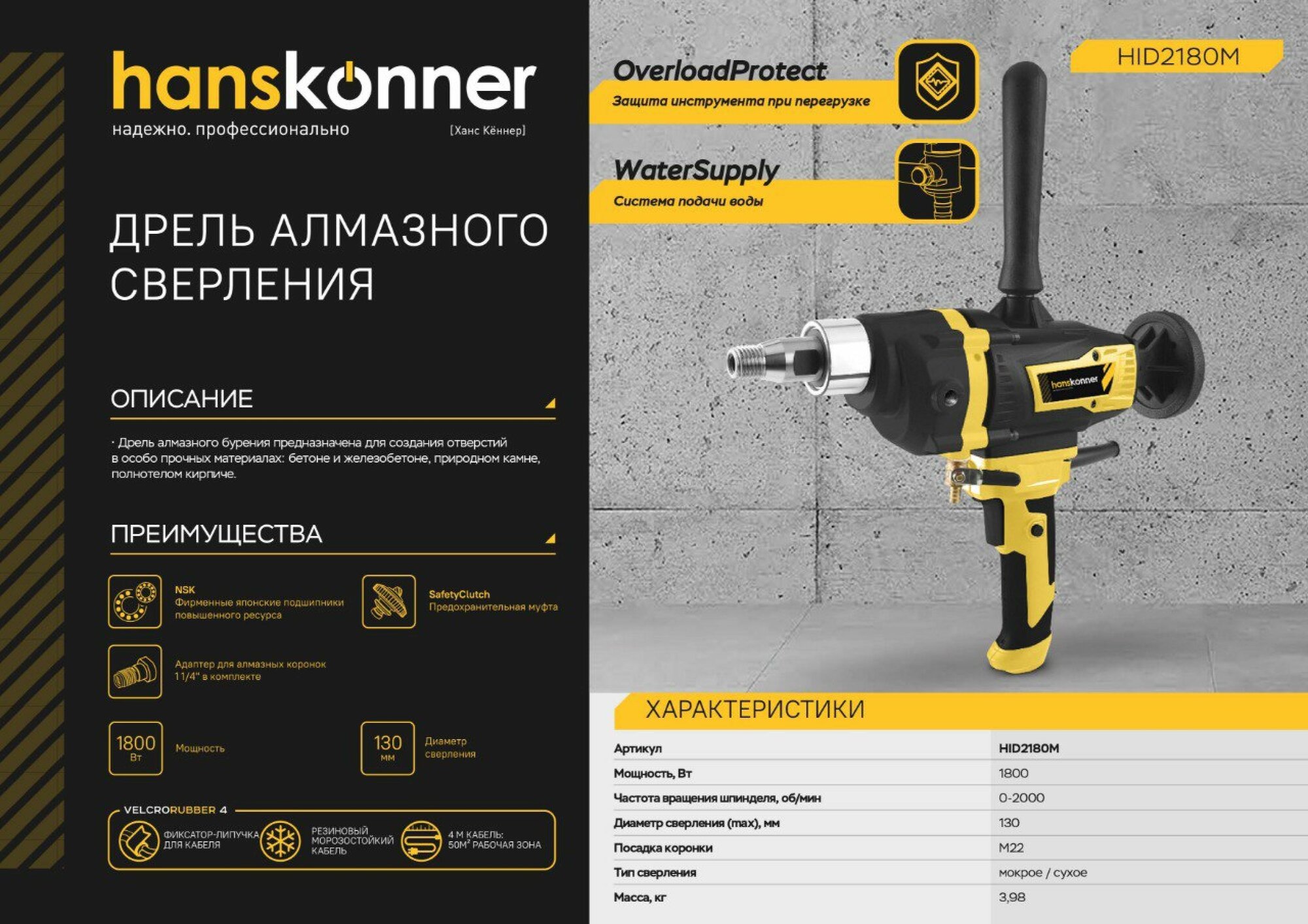 Дрель алмазного сверления Hanskonner hid2180m интересное:
