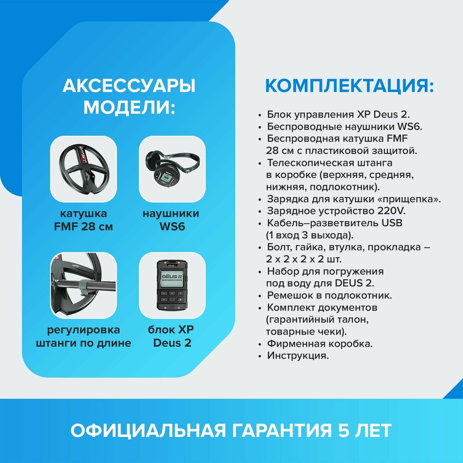 | Комплектация | - блок управления - катушка FMF 28 см (беспроводная) - пластиковая защита на катушку - телескопическая штанга - наушники WS6 - чехол для защиты блока управления - прищепка (для зарядки катушки) - лямка для подлокотника - болт, гайка, прокладки для крепления катушки - зарядное устройство от сети 220V - USB-кабель - инструкция пользователя - гарантийный талон |