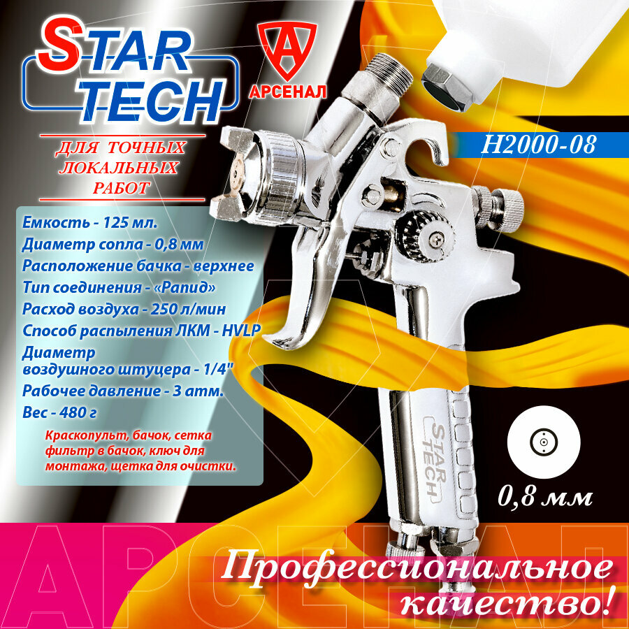 Мини краскопульт пневматический, сопло 0,8 мм, верхний пластиковый бачок 125 мл. STAR TECH. HVLP, H2000-08 интересное: