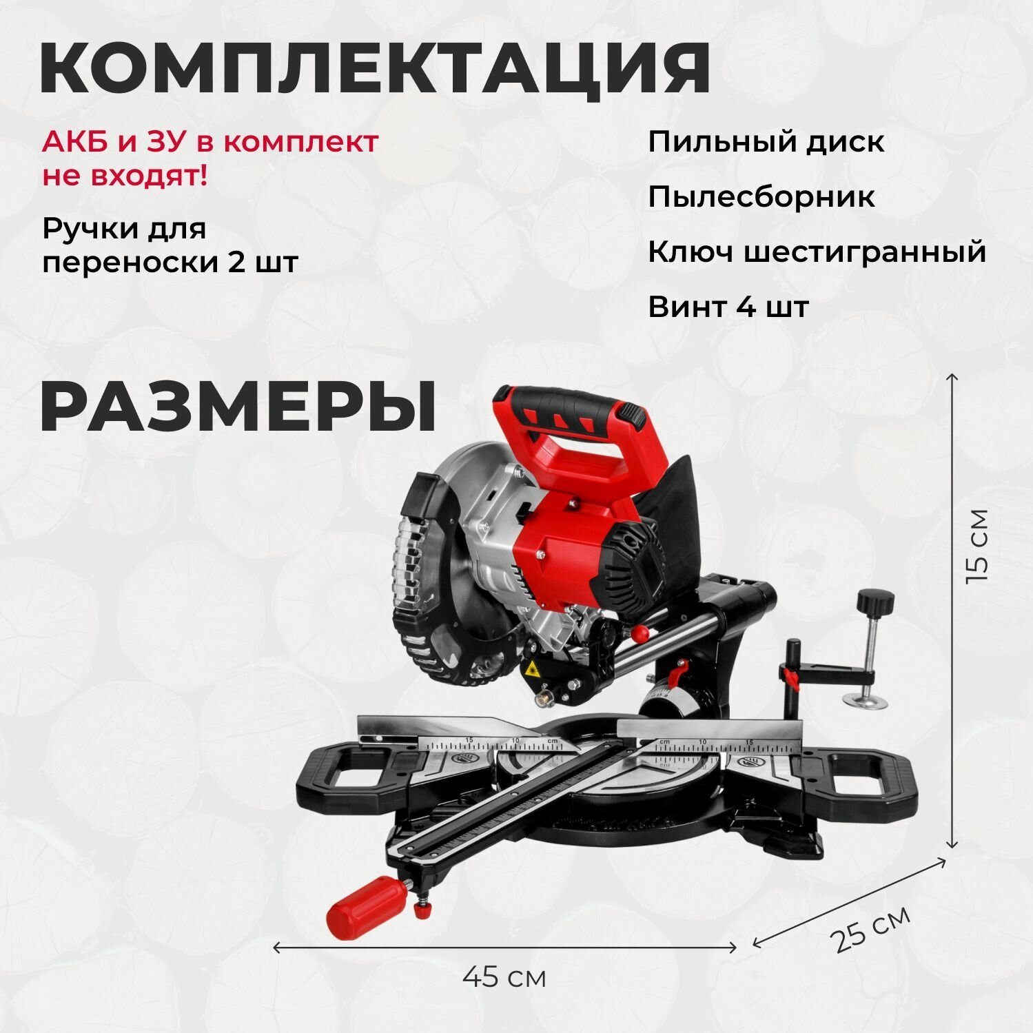| Комплект поставки | аккумуляторная торцовочная пила, пильный диск, пылесборник, ручки для переноски (2 шт.), ключ шестигранный, винт (4 шт) |