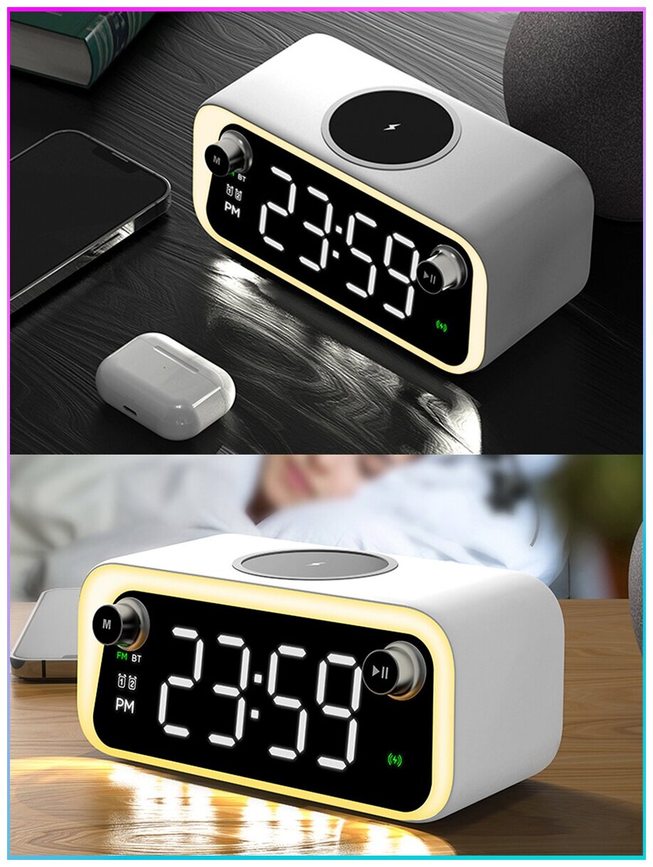 Настольные электронные часы с будильником MIRRON A575/FM-радио/Bluetooth колонка (speaker)/Беспроводная зарядка 15 Вт/Белый корпус/Для детской, спальни/Часы с термометром/Сенсорное управление подсветкой/Подарок интересное: