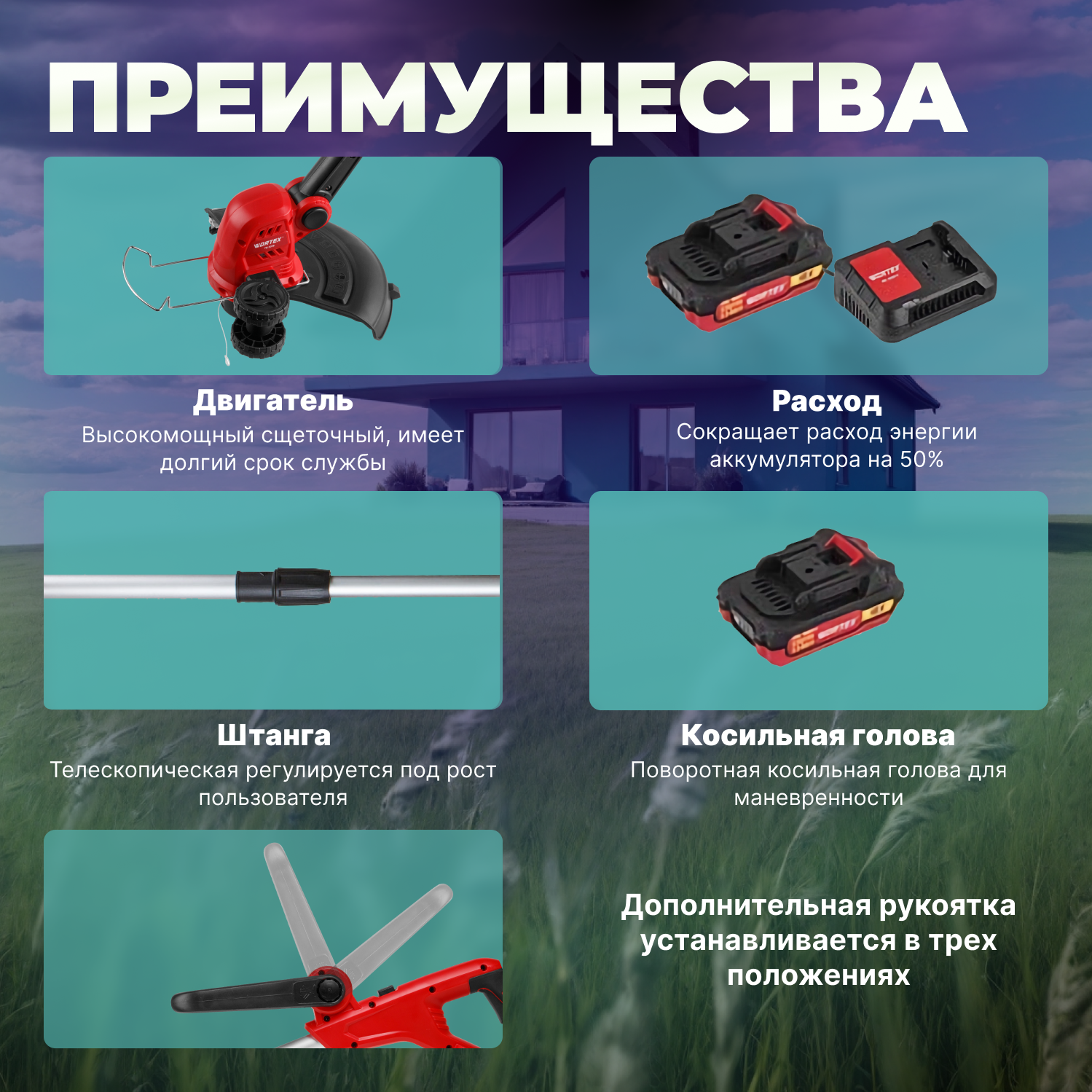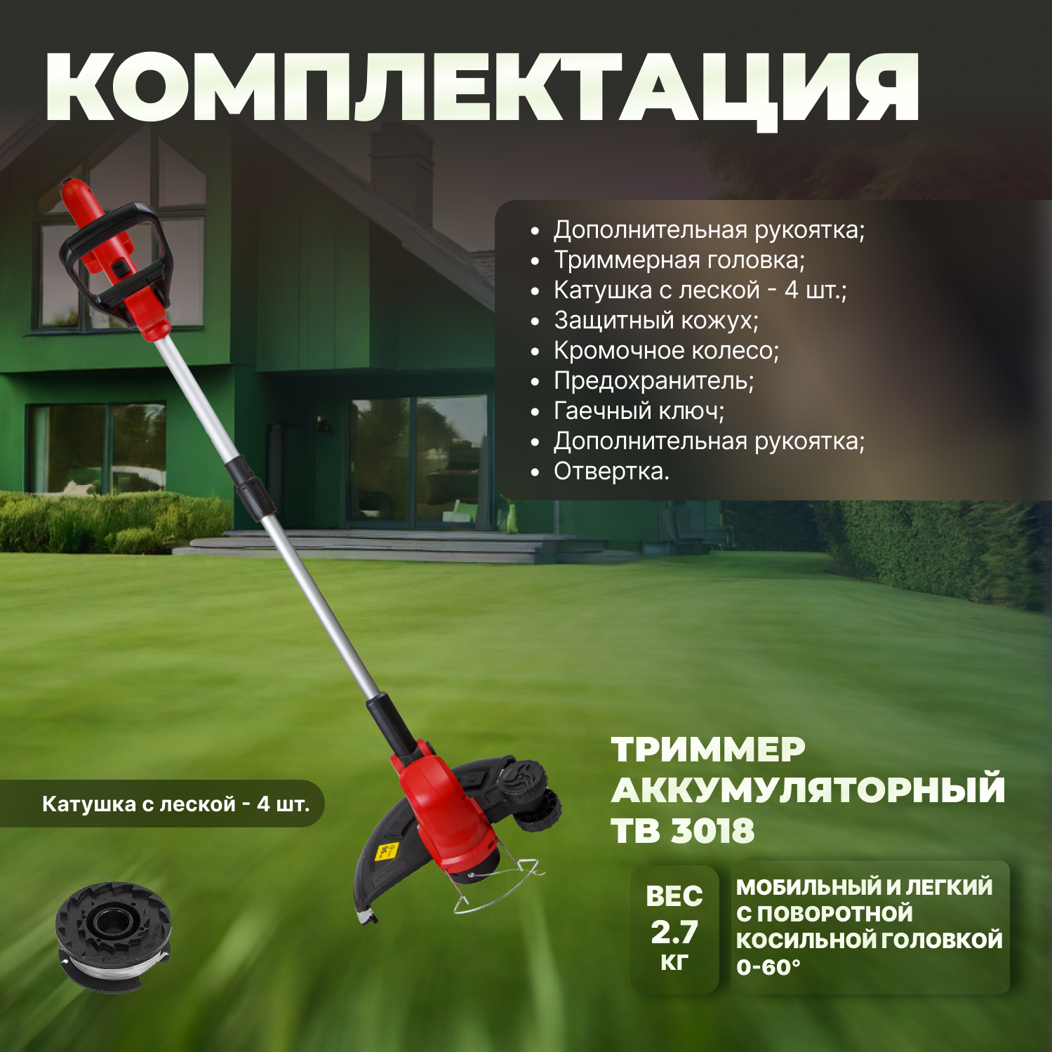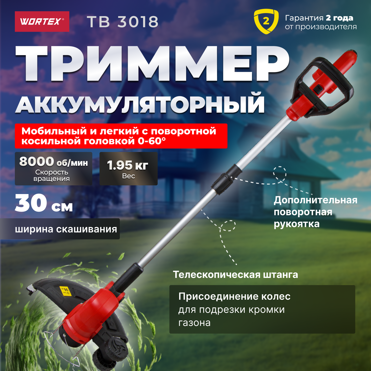 | Подробная комплектация | Триммер аккумуляторный WORTEX TB 3018 ALL1; Дополнительная рукоятка; Катушка под леску (установлена); Катушка с леской - 4 шт.; Защитный кожух; Кромочное колесо; Предохранитель; Винт; Отвертка; Паспорт; БЕЗ аккумулятора и зарядного устройства |