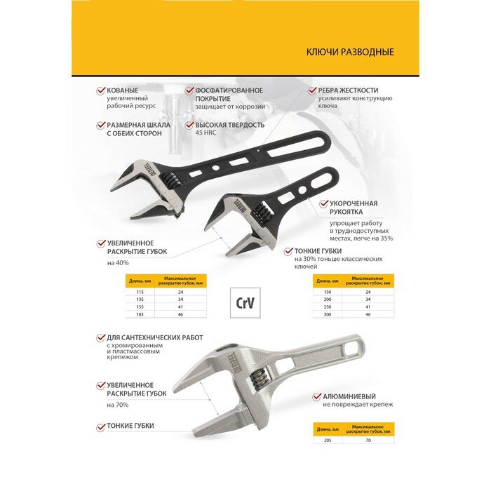 Ключ разводной, 300 мм, CrV, кованный Denzel (15750) интересное: