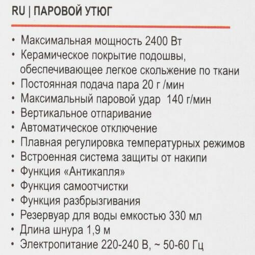| Дополнительные функции | паровой удар / постоянная подача пара / регулировка температуры / система самоочистки / сухая глажка / функция разбрызгивания |