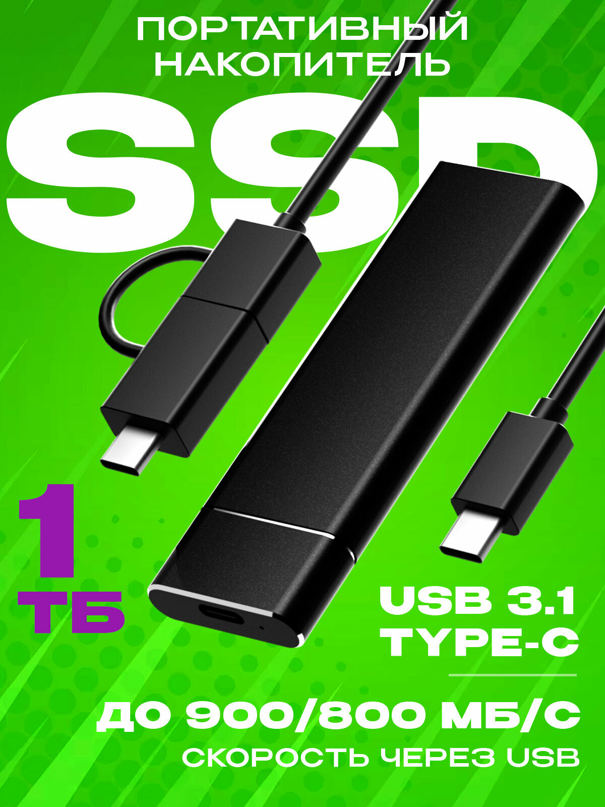 Внешний портативный SSD (Черн./1024ГБ). Хранилище для смартфона, телефона, компьютера.