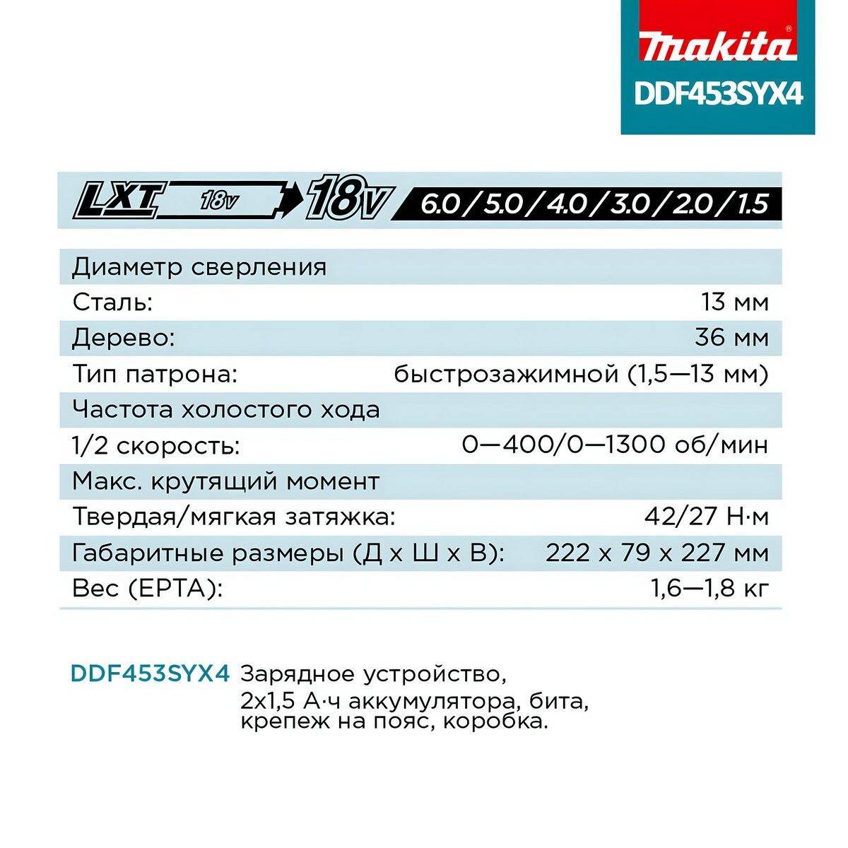 MAKITA DDF453SYX4 Дрель-шуруповерт с АКБ 18.0В 1.5Ач (2АКБ Li-Ion) MAKITA