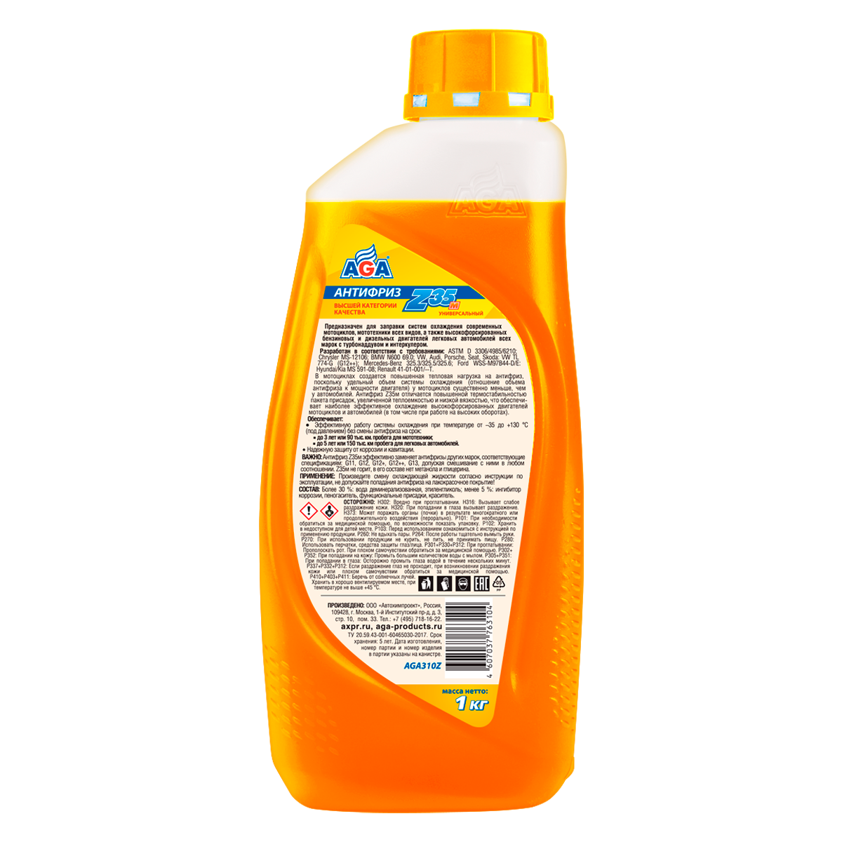 | Дополнительная информация | Антифриз AGA-Z35м – это универсальная охлаждающая жидкость высшей категории качества. ПРЕДНАЗНАЧЕН для заправки систем охлаждения современных мотоциклов, мототехники всех видов, а также высокофорсированных бензиновых и дизельных двигателей легковых автомобилей всех марок с турбонаддувом и интеркулером. |