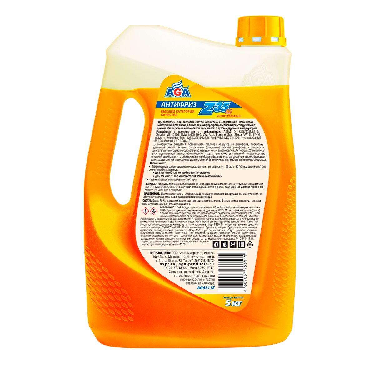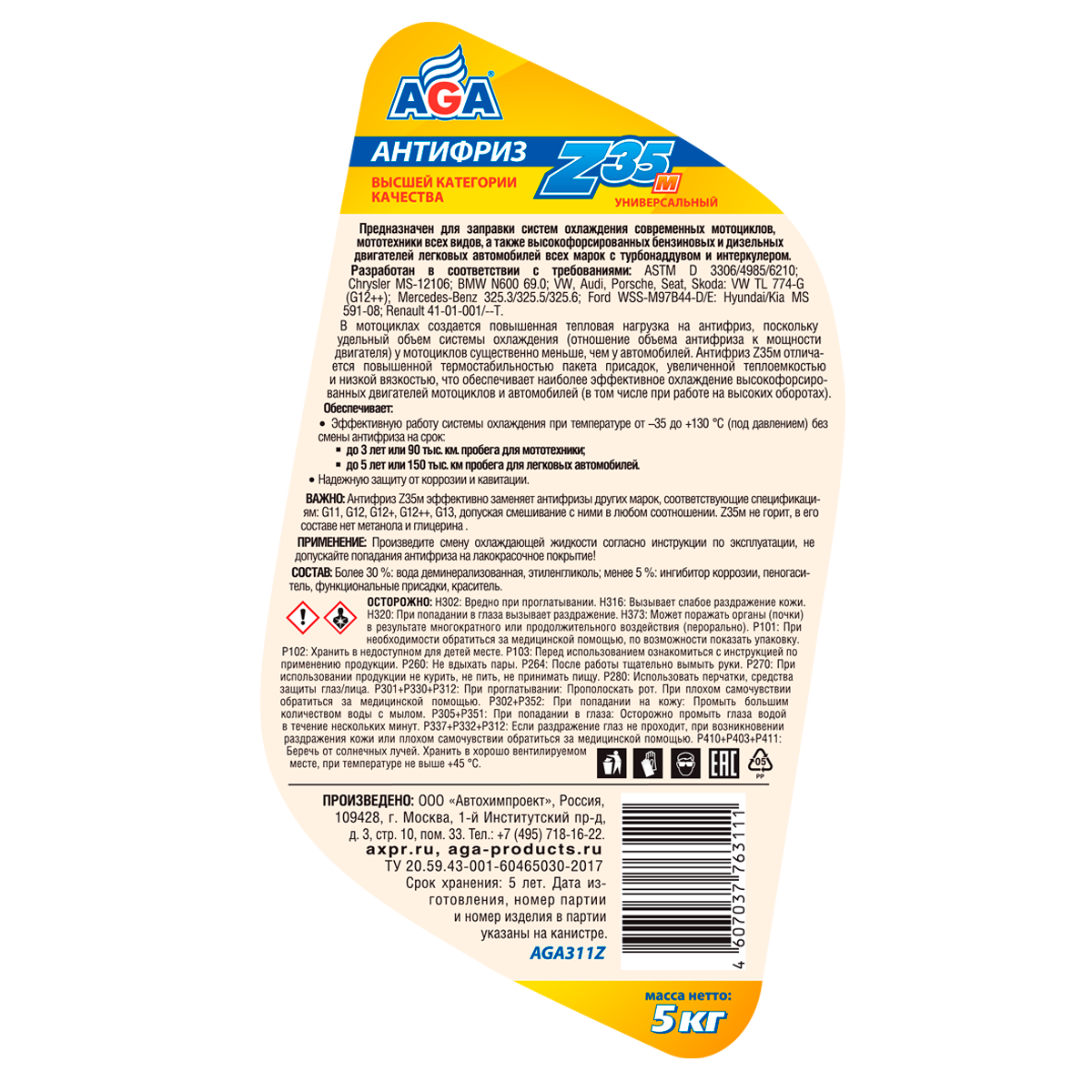| Дополнительная информация | Антифриз AGA-Z35м – это универсальная охлаждающая жидкость высшей категории качества. ПРЕДНАЗНАЧЕН для заправки систем охлаждения современных мотоциклов, мототехники всех видов, а также высокофорсированных бензиновых и дизельных двигателей легковых автомобилей всех марок с турбонаддувом и интеркулером. |