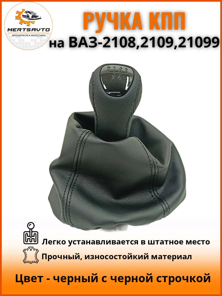 Ручка КПП с чехлом люкс-черный на ВАЗ-2108, 2109, 21099 (Lada Priora) ручка коробки переключения передач, черный с белой строчкой