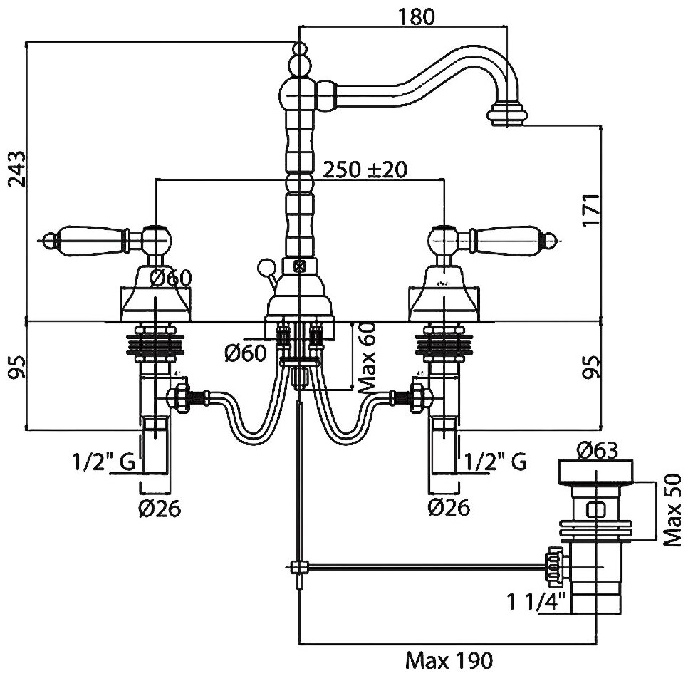 Cezares Смеситель на раковину на три отверстия с донным клапаном CEZARES DIAMOND-BLS2-02-Sw