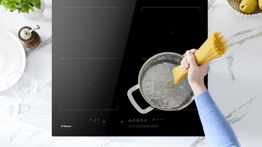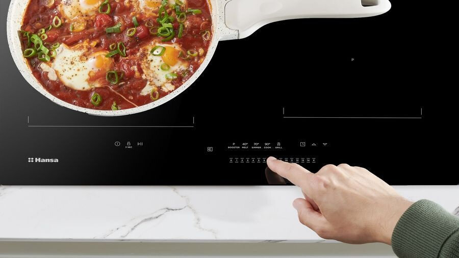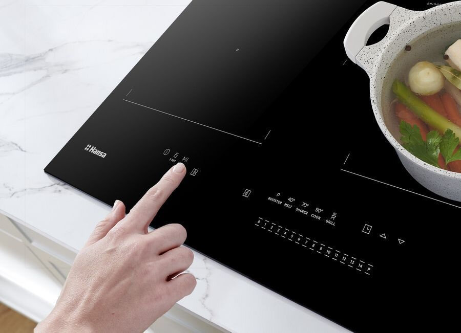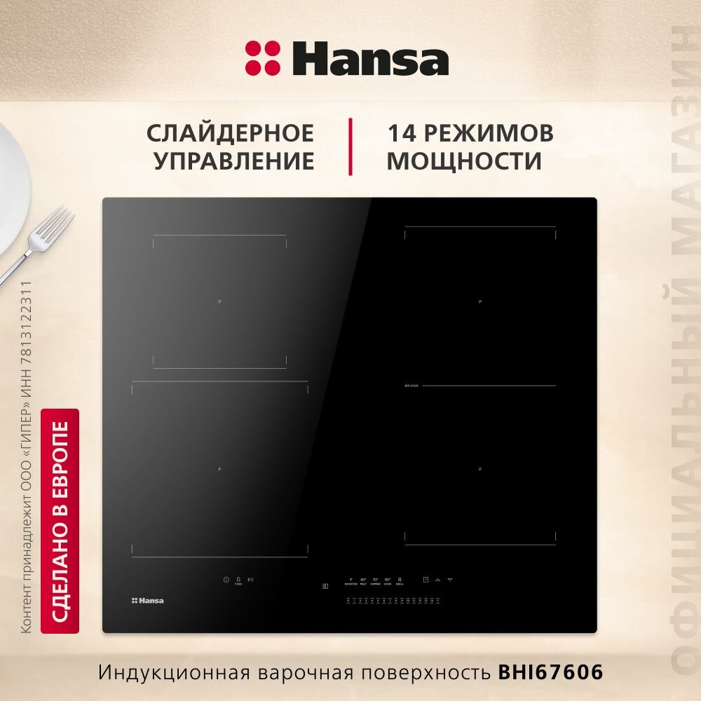 Индукционная варочная поверхность Hansa BHI67606, 60 см, слайдерное управление, конструкция SlimHob, функция памяти, 14 режимов мощности, Power Booster на всех зонах, гриль