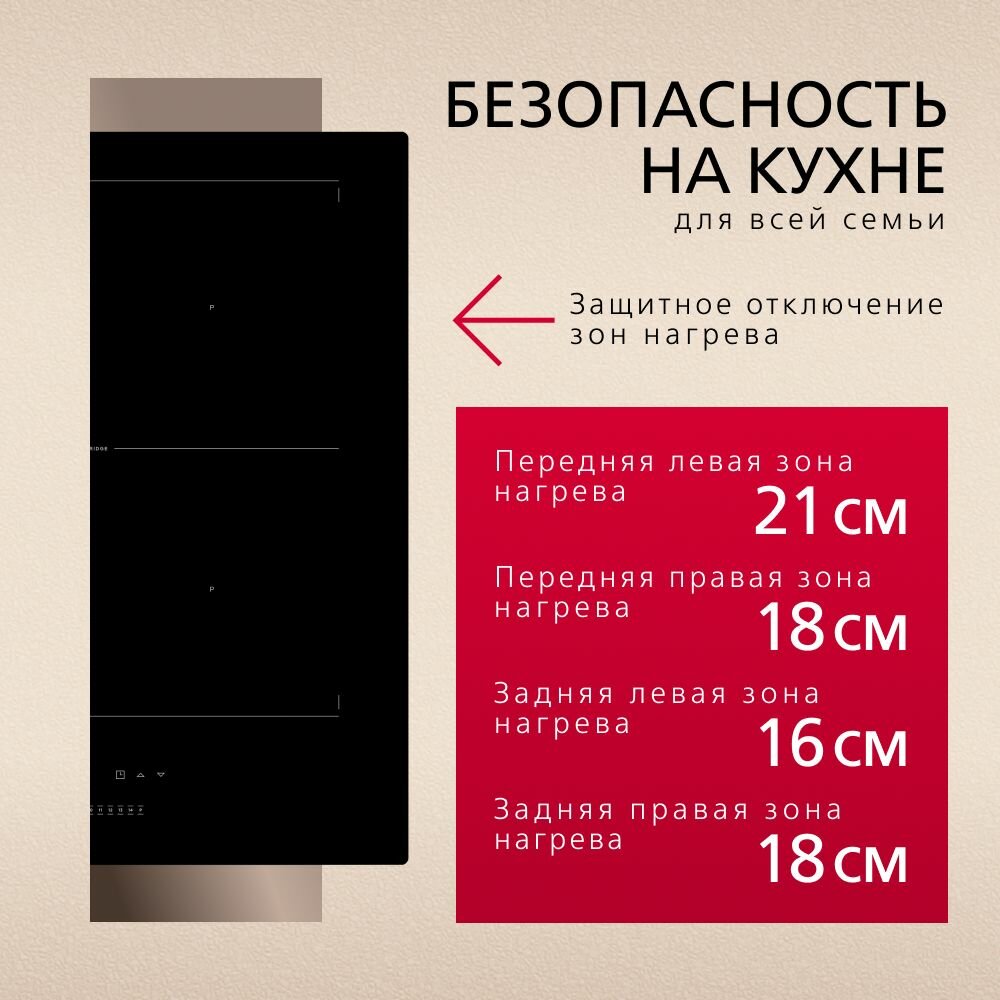 | Безопасность | защитное отключение конфорок / индикатор остаточного тепла |