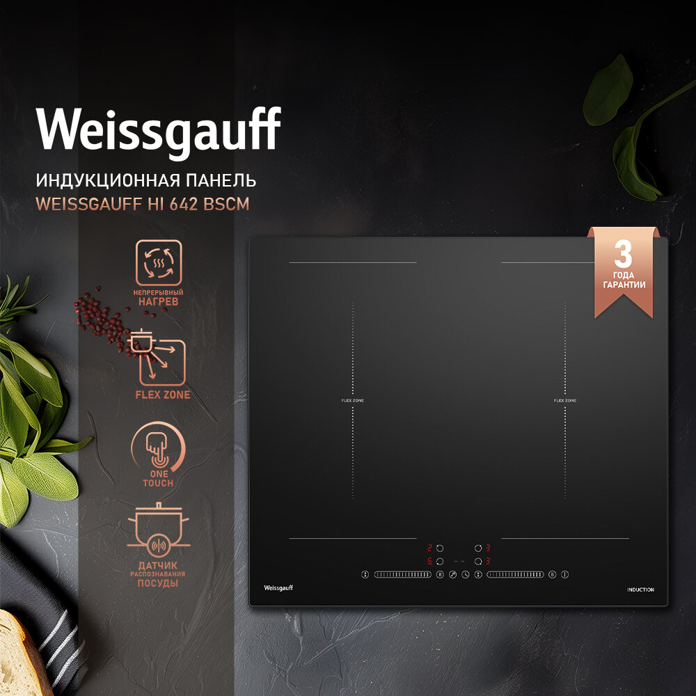 Индукционная варочная панель с инвертором и слайдером Weissgauff HI 642 BSCM 3 года гарантии, Непрерывный нагрев, Свободная зона Flex Zone, Сенсорное управление, Двойной слайдер, Функция Boost, Мощность 7400 Вт, 9 уровней мощности, Таймер 99 мин