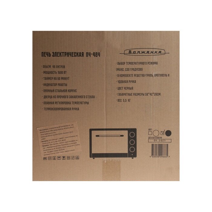 Купить Мини-печь Волжанка Пч-48ч, 1500 Вт, 48 л, 60-230 C, таймер, чёрная Волжанка 10398982 .