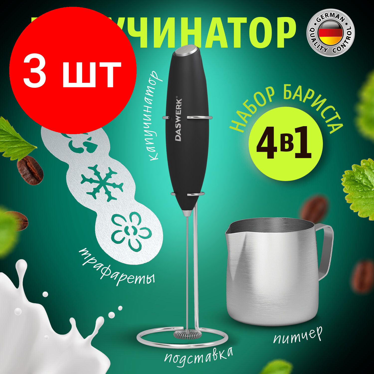 Капучинатор электрический, вспениватель молока для дома и кухни с подставкой, питчером, трафаретами 4 в 1, черный, Daswerk, 456181