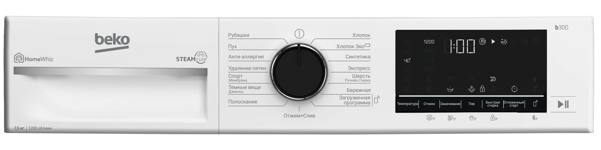 | Программы | быстрая стирка / замачивание / полоскание / ручная стирка / стирка деликатных тканей / стирка джинсов / стирка паром / стирка пуховых вещей / стирка синтетики / стирка спортивной одежды / стирка хлопка / стирка шерсти / удаление пятен |