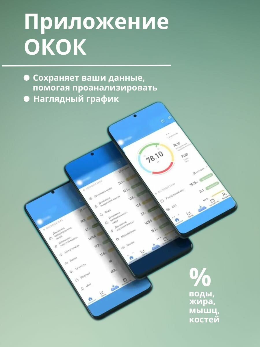 | Дополнительные функции | постановка цели / расчет ИМТ (BMI) |
