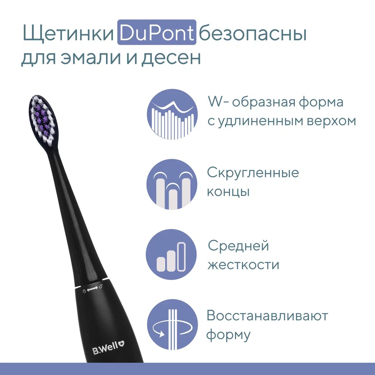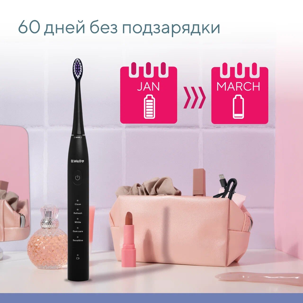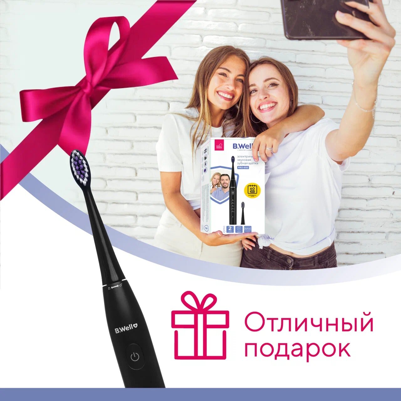 Электрическая зубная щетка B.Well PRO-850, звуковая, премиальная щетина DuPont средней жесткости, 5 режимов, 60 дней без подзарядки, 2 насадки, черная