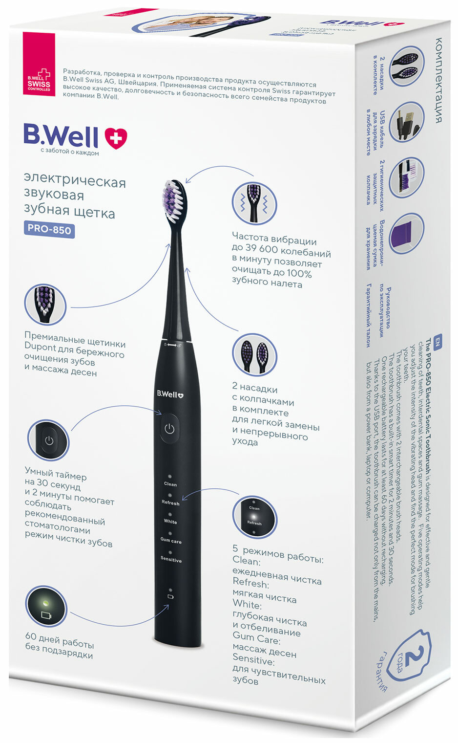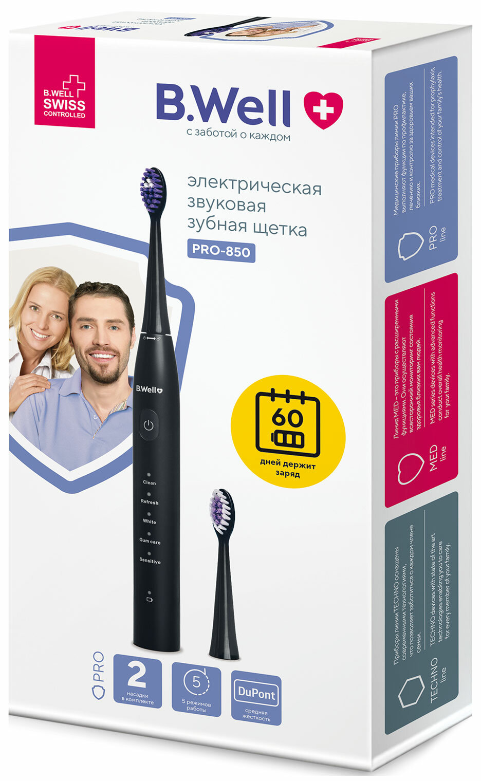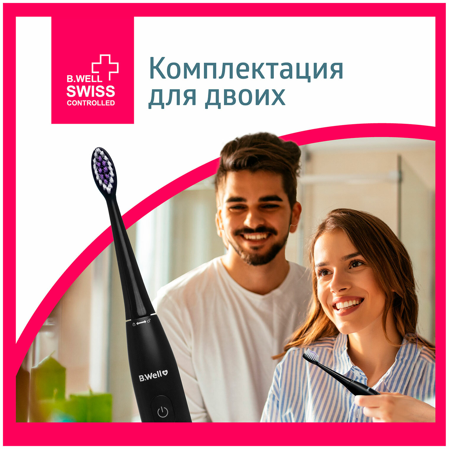 Электрическая зубная щетка B.Well PRO-850, звуковая, премиальная щетина DuPont средней жесткости, 5 режимов, 60 дней без подзарядки, 2 насадки, черная