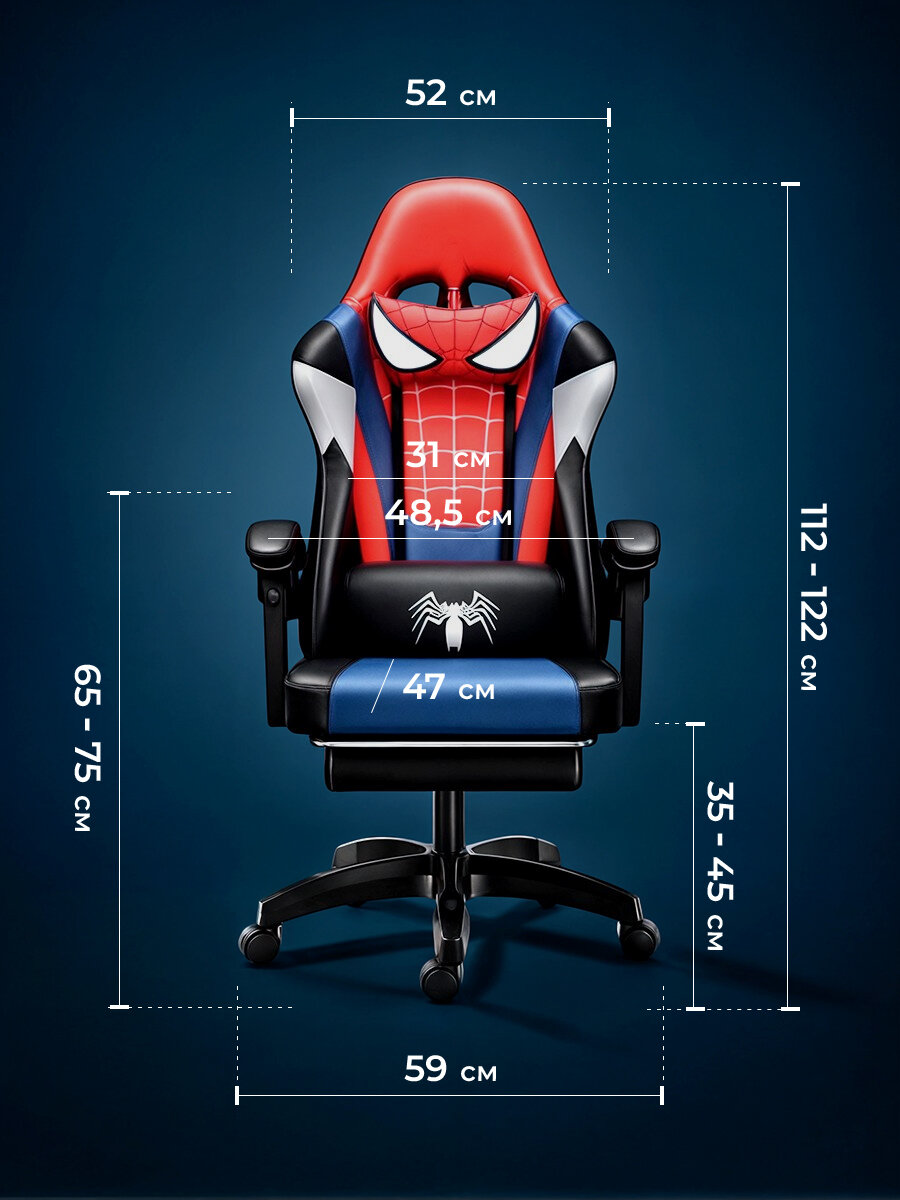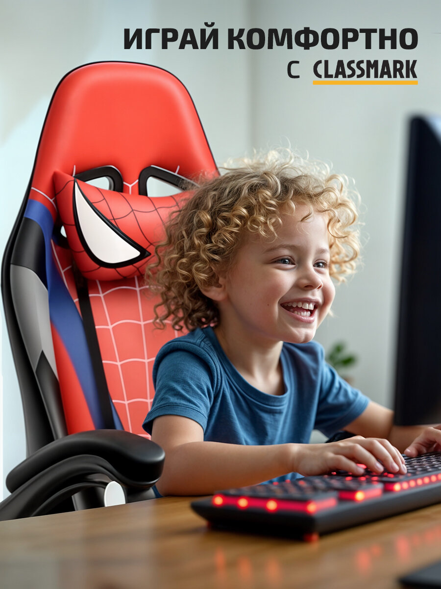 СохранитьКресло компьютерное игровое геймерское Classmark FT-SM Человек Паук, офисное с подушками для спины и шеи на колесиках, красно-сине-черное интересное: