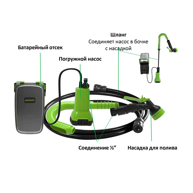 | Подробная комплектация | погружной аккумуляторный насос с отдельным батарейным отсеком Greenworks, шланг 2 метра с крюком для установки на борту бочки, пистолет-распылитель для полива, руководство по эксплуатации, гарантийный талон; внимание: садовый шланг (может подключаться между насосом и пистолетом-распылителем) в комплект не входит! Внимание: этот комплект поставляется без аккумулятора (АКБ) и ЗУ |