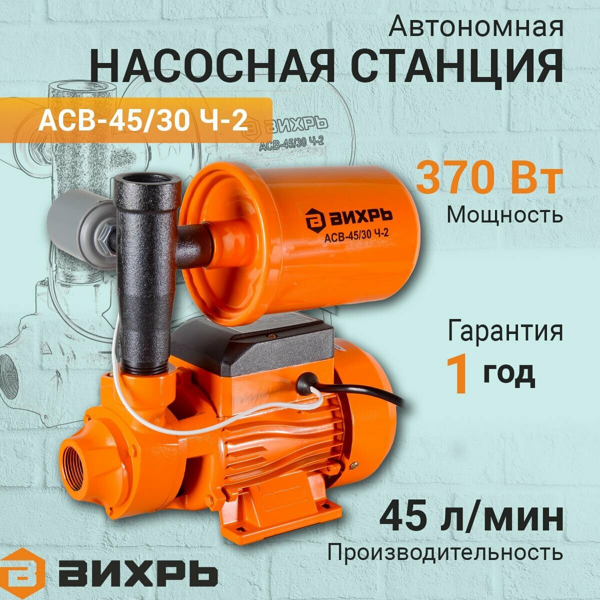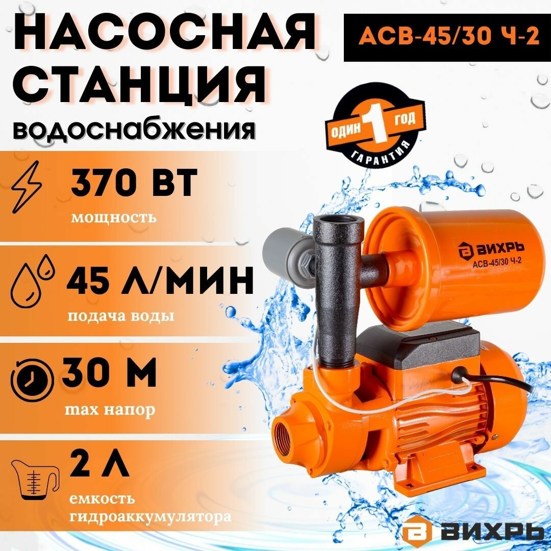 Автономная станция водоснабжения Вихрь АСВ-45/30 Ч-2, 370 Вт, напор – 30 м, 45 л/мин, гидроаккумулятор – 2 л,