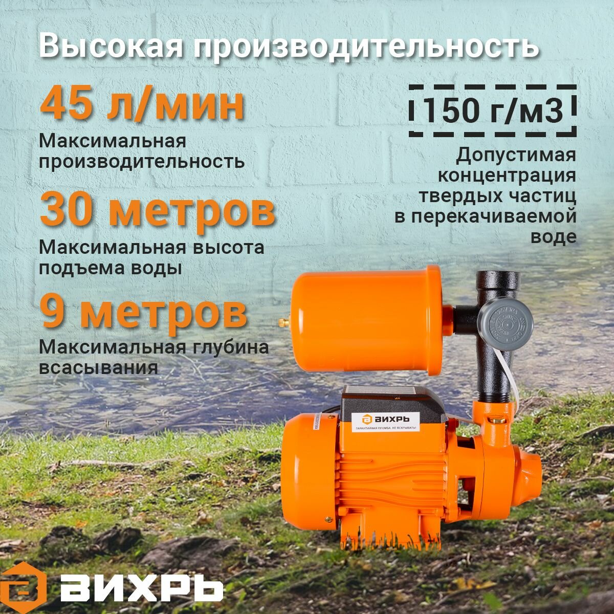 Насосная станция / Автономная станция водоснабжения -45/30 Ч-2 Вихрь (370 Вт, напор – 30 м, 45 л/мин, гидроаккумулятор – 2 л, глубина всасывания – 9 м, G1”)
