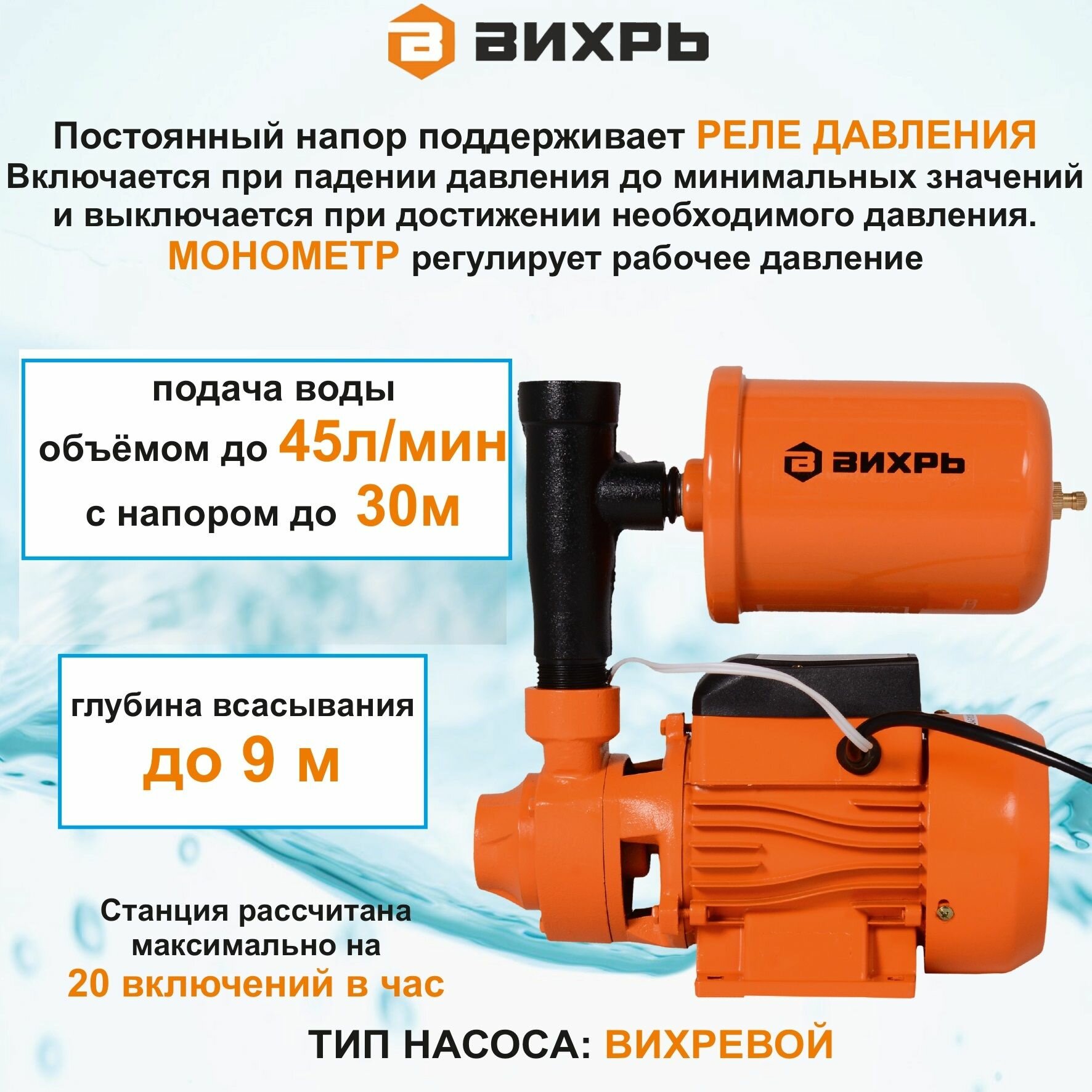 Автономная станция водоснабжения для дома и дачи АСВ-600/20Н Вихрь ( 600 Вт, напор 35 м, 55 л/мин, гидроаккумулятор 20 л, глубина всасывания 9 м)