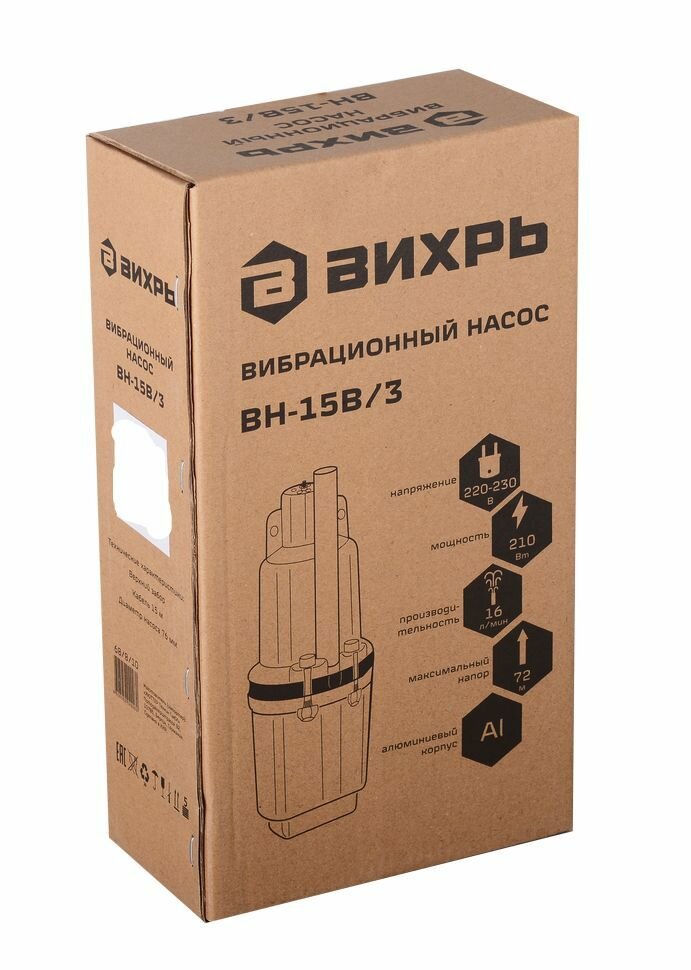 Вибрационный насос ВН-15В/3 Вихрь, высота подъема 72м, верхний забор воды, кабель 15м