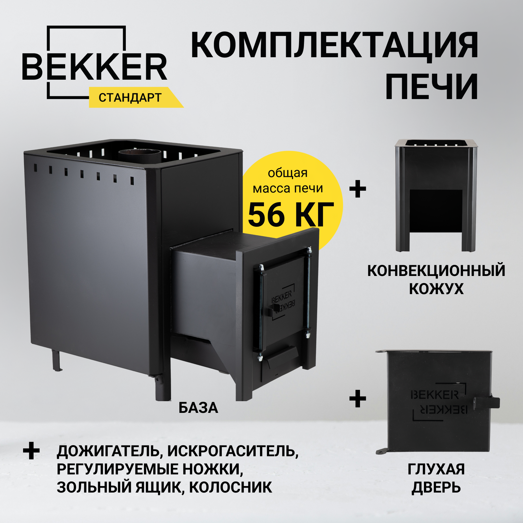 Печь для бани BEKKER - Стандарт (6 мм), короткое горло, конвекция, глухая дверца, печь дровяная, печь банная