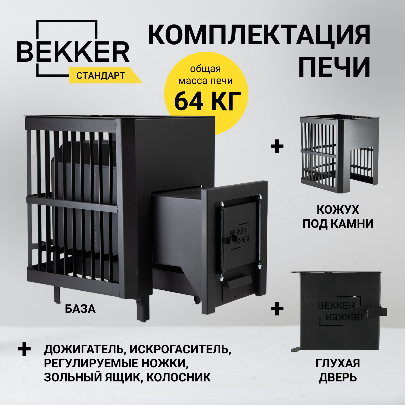 Печь для бани BEKKER - Стандарт (6 мм), короткое горло, кожух под камни, глухая дверца, печь дровяная, печь банная