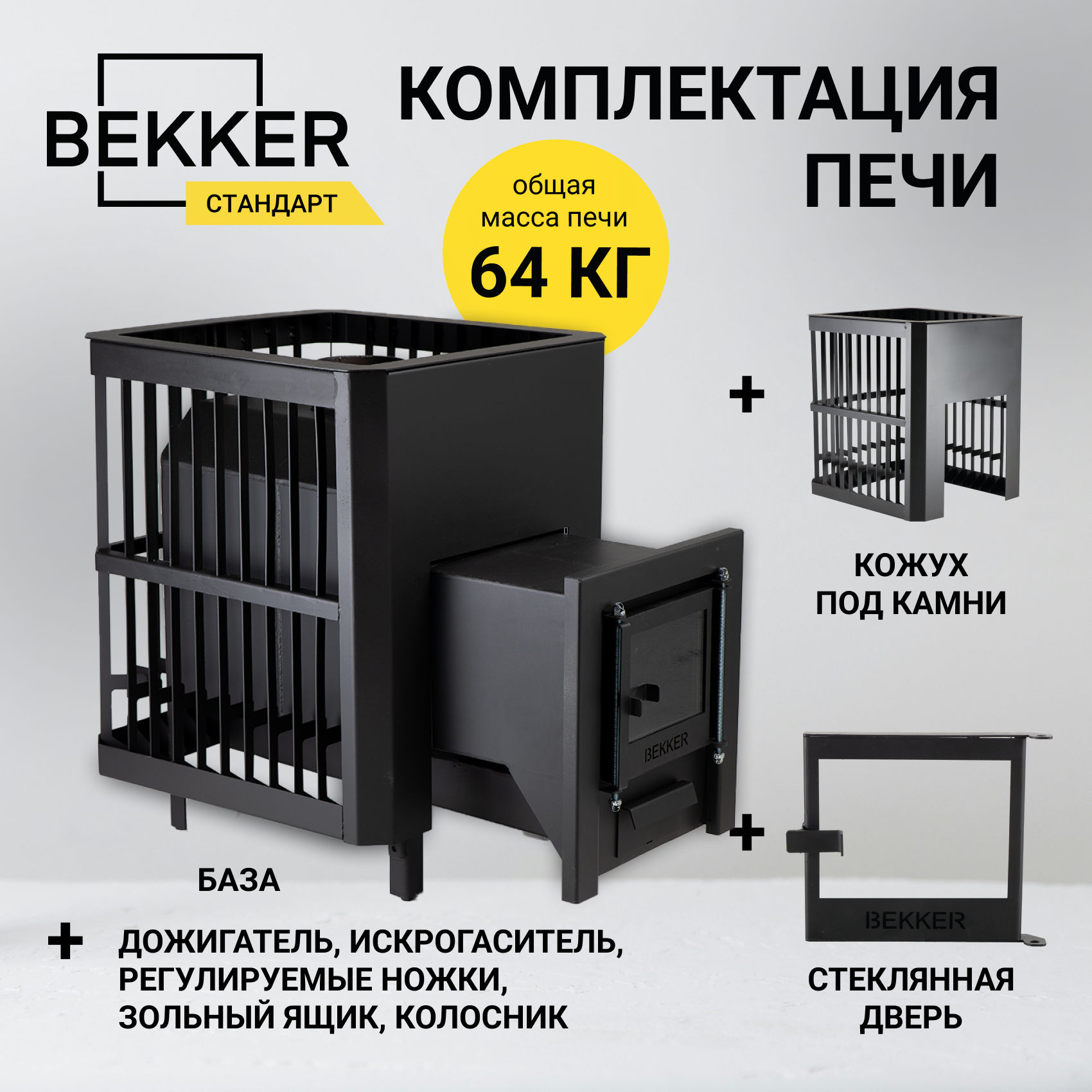 Печь для бани BEKKER - Стандарт (6 мм), короткое горло, кожух под камни, стеклянная дверца, печь дровяная, печь банная