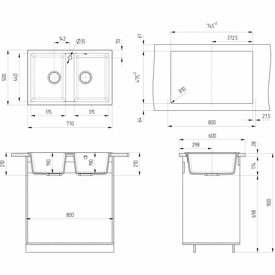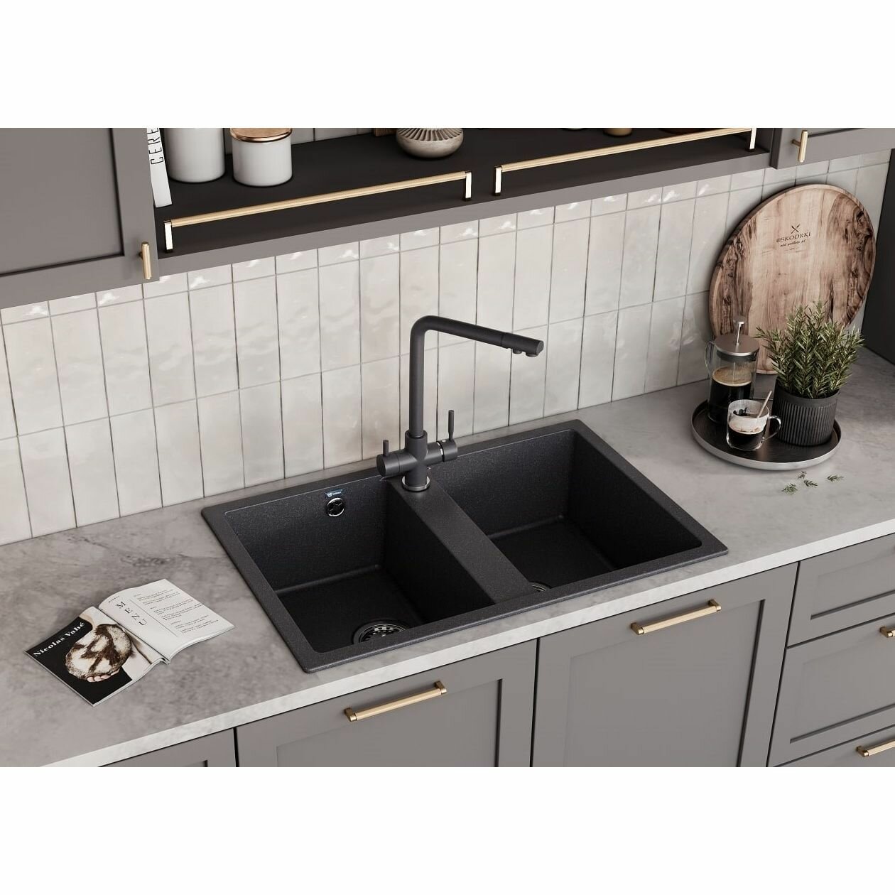 Мойка кухонная Ulgran из искусственного мрамора прямоугольная U-608, цвет: черный, база: 74.5х47.5 см, арт. U-608-308 интересное: